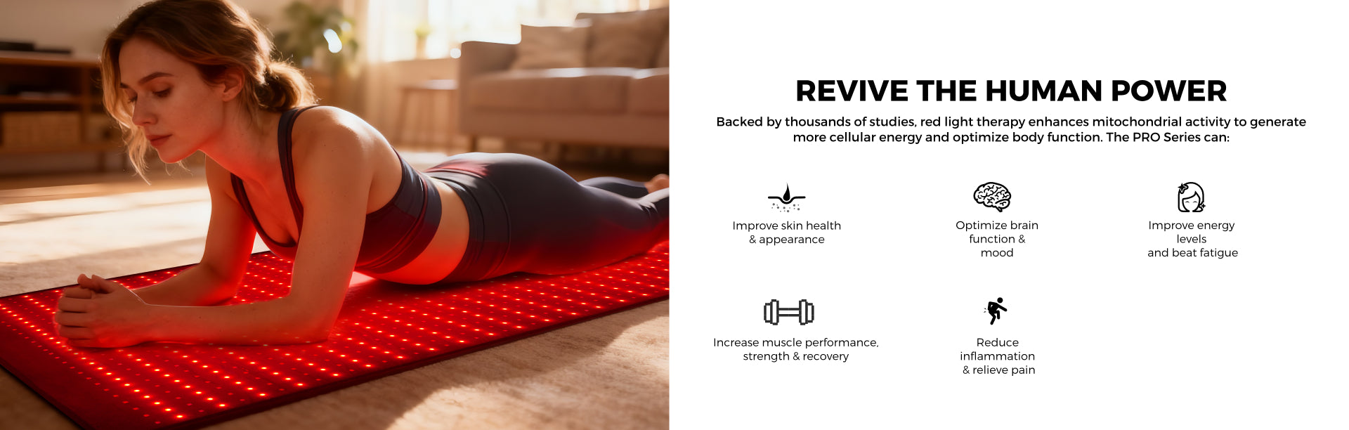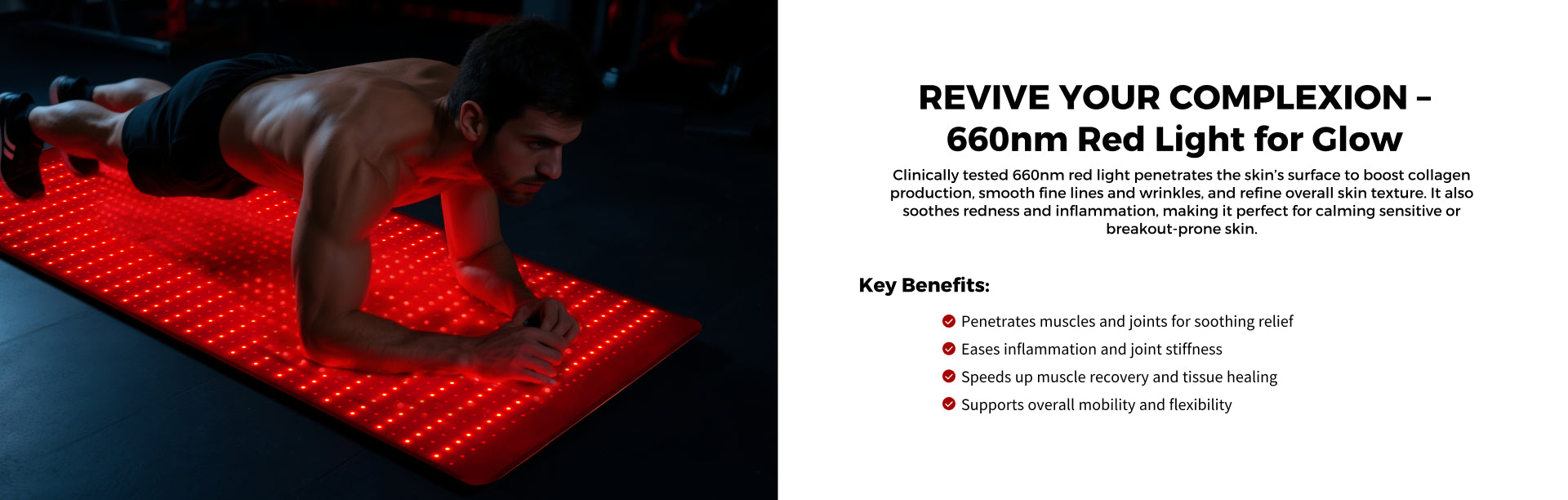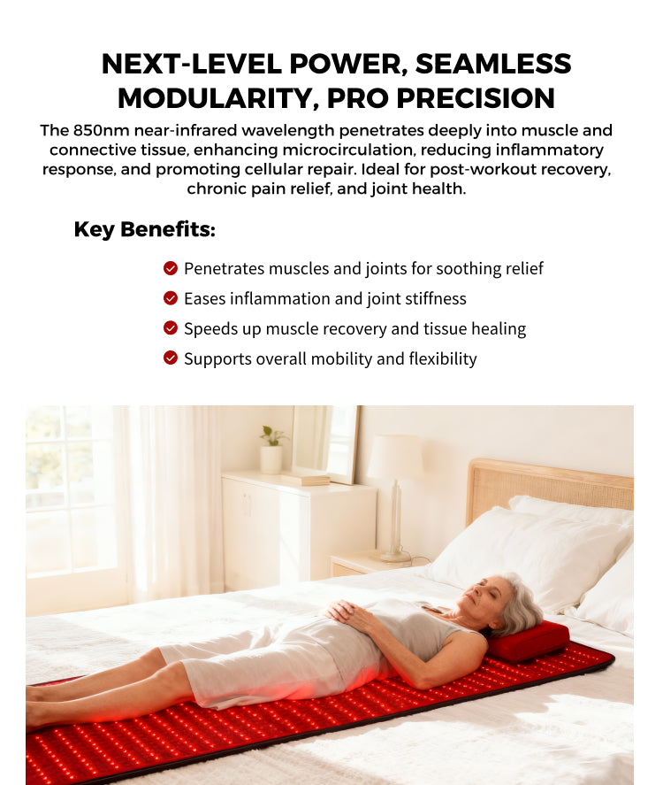The QuasarMD Mat is a full-body light therapy mat designed for recovery, wellness and comfort. It uses dual-wavelength LEDs (660 nm red light + 850 nm near-infrared light) to penetrate tissue, support circulation, reduce inflammation, and promote repair.