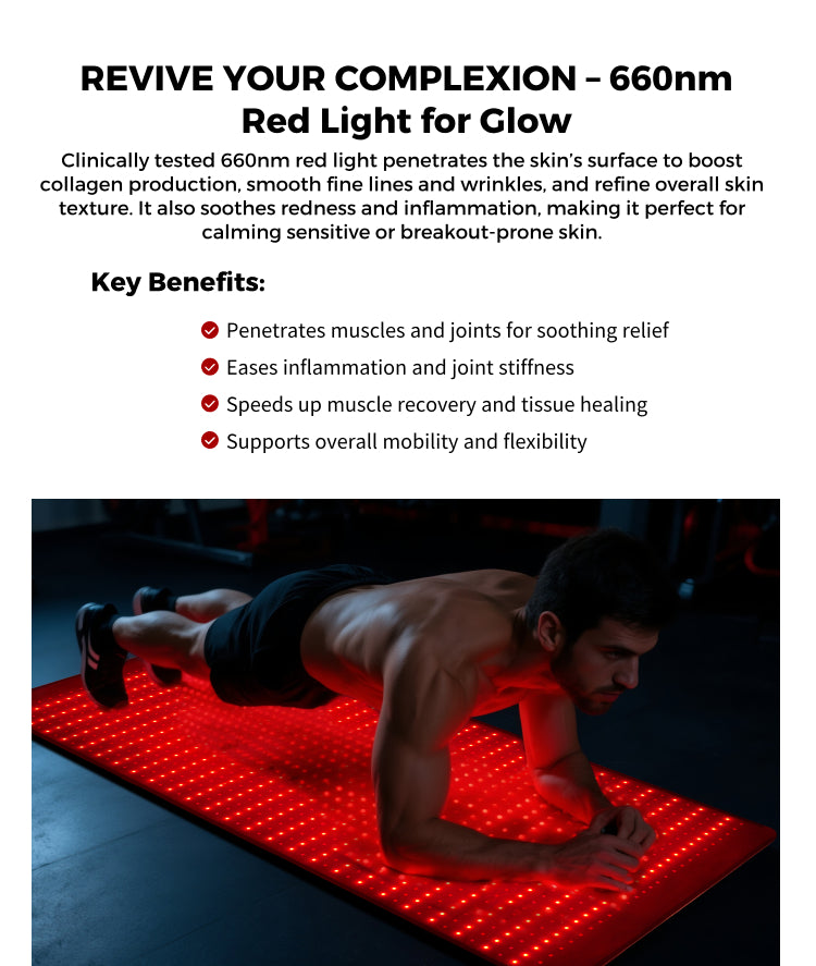 Place the mat on a firm surface (floor, bed frame, or mattress) with minimal soft cushioning underneath to avoid overheating. Lie on it so your body has good exposure to the LEDs. For targeted use (e.g., back, legs), you can expose just that region or use the full coverage. Stay relaxed, set the timer for 15-30 minutes, then rest or move on with your day.
